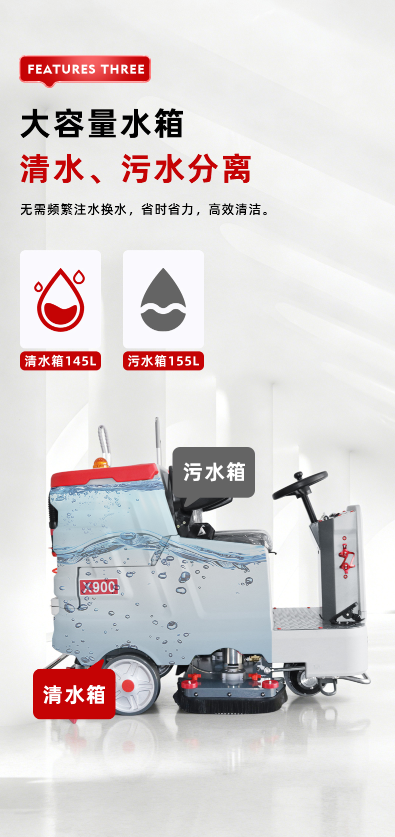 驾驶式洗地机X900产品介绍一、产品概述​产品简介:驾驶式洗地机X900整机设计美观大气,操作简单易上手,一台机器可代替10-15人左右,适用于物业、医院、工厂、仓库、机场、车库等大面积室内场景地面清洁作业。产品定位:适用于大型工厂、物流仓库、商场超市等大面积硬质地面清洁场景,满足企业对高效、深度清洁的需求。设计理念:秉持人性化设计理念,注重操作便捷性与